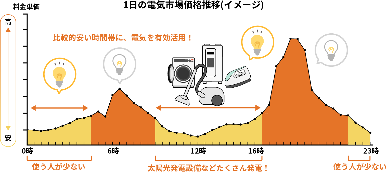 電気を使う人が少ない深夜帯や、太陽光発電設備などでたくさん発電できる日中帯などは、料金単価が比較的安くなる傾向があります。安い時間帯には電気を使って、逆に高い時間帯には電気の使用を控える等、電気の使い方を工夫することで、電気料金を抑えることが可能です!